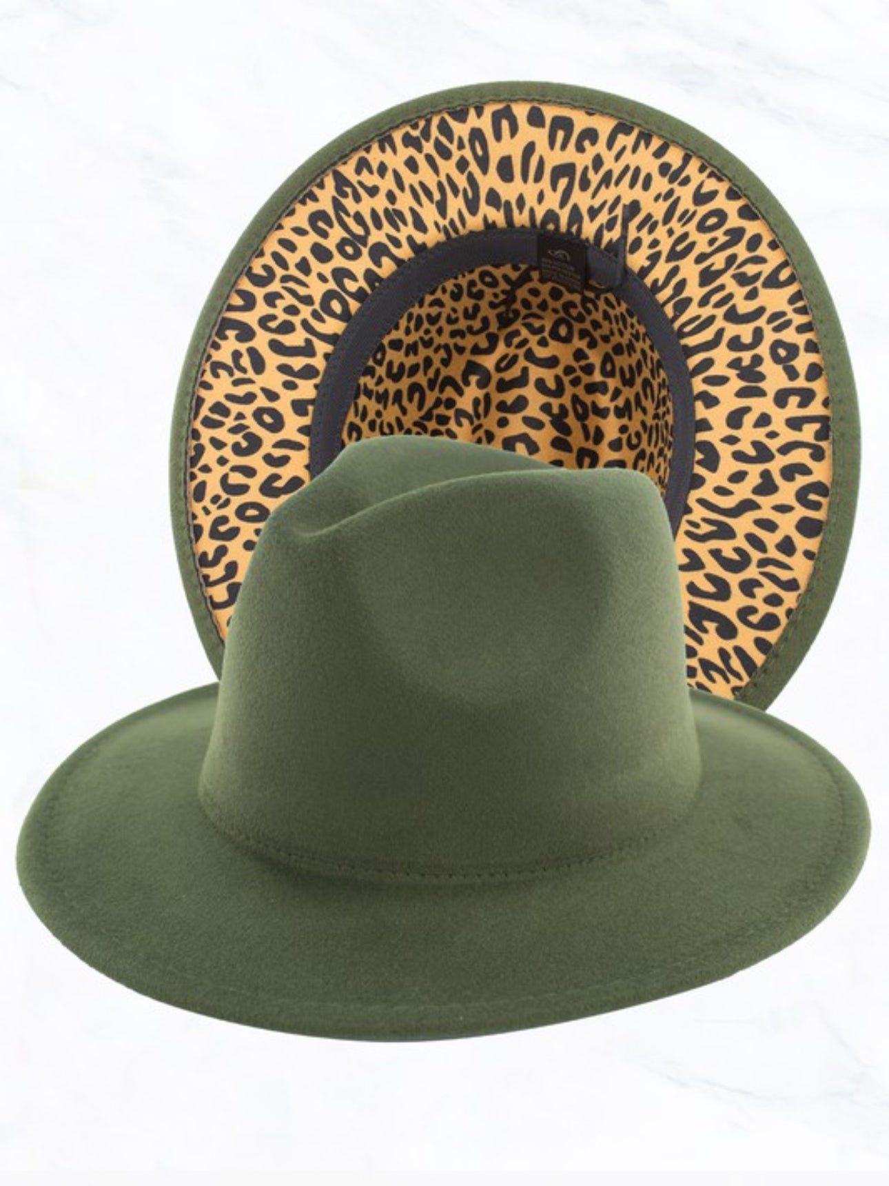 Stand out with this green fedora, featuring a stylish leopard print under the brim for a playful and unexpected accent. The rich green exterior exudes sophistication and versatility, while the hidden leopard lining adds a bold, fashionable twist.