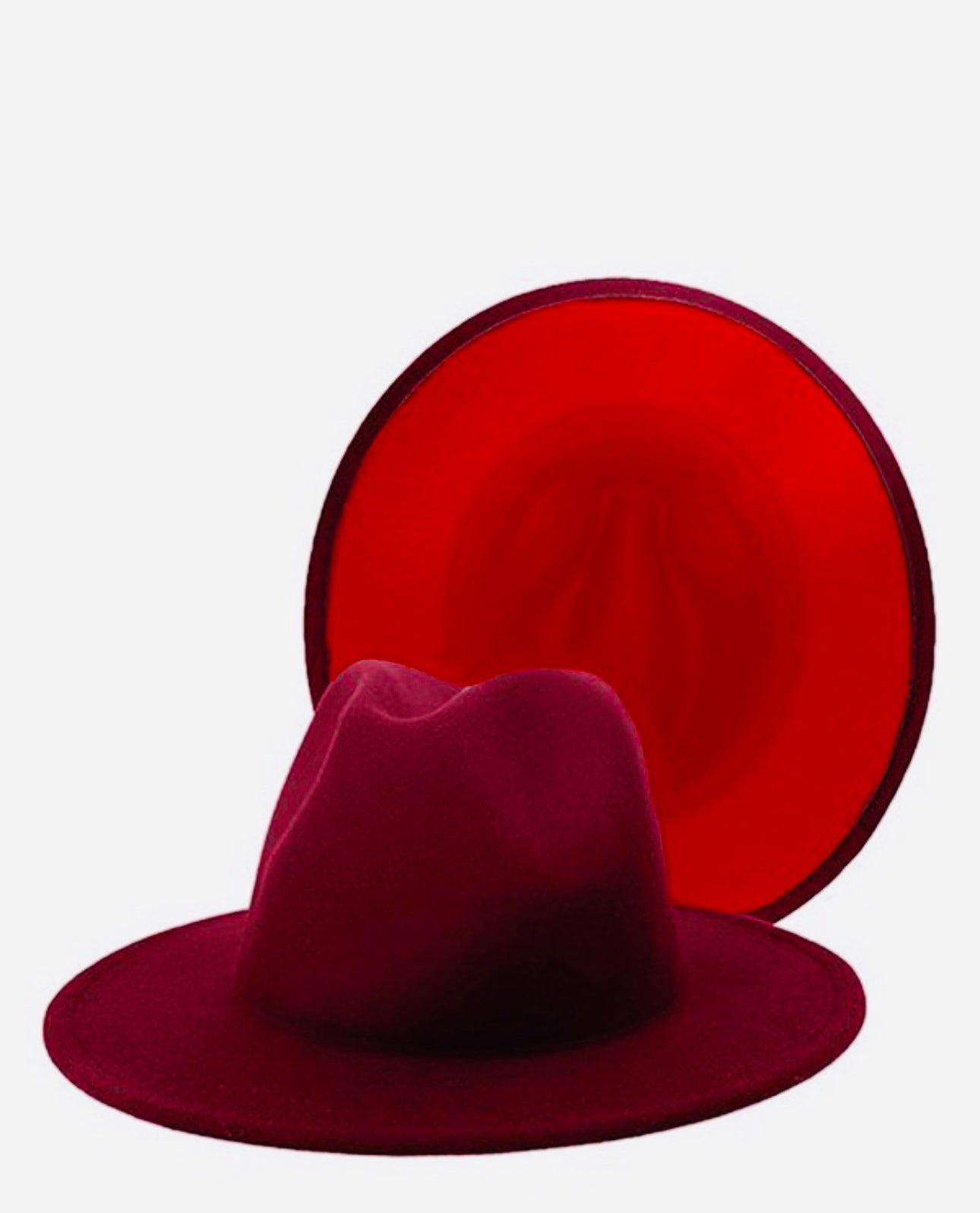 Make a bold statement with this wine-colored fedora, featuring a rich red lining under the brim for a subtle yet striking contrast. The deep, luxurious wine exterior exudes elegance and sophistication, while the hidden red detail adds a playful and unexpected twist.