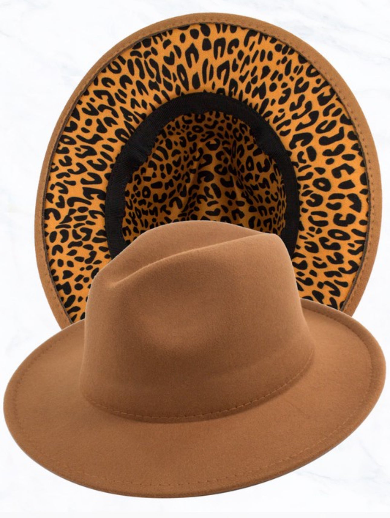 Add a stylish twist to a classic look with this khaki tan fedora, featuring a bold leopard print under the brim for a playful and unexpected accent. The warm, neutral khaki exterior offers timeless versatility, while the hidden leopard lining adds a touch of personality and flair.