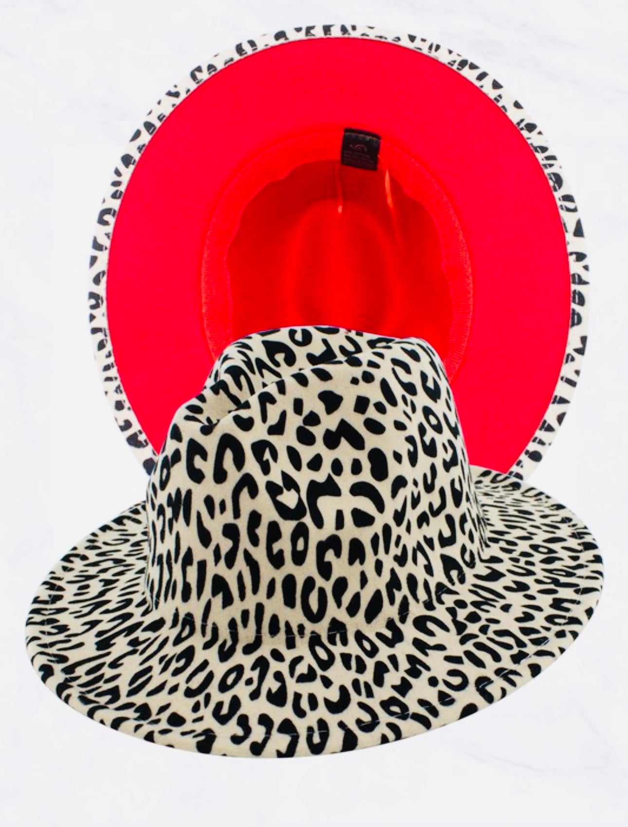 This is a fashionable fedora-style hat featuring a black and white leopard print pattern on the outside. The hat has a wide brim and a structured crown. The underside of the brim and the interior lining are a bright, bold red, creating a vivid contrast with the monochrome leopard print. The combination of the neutral exterior and striking red interior gives the hat a trendy and eye-catching look.