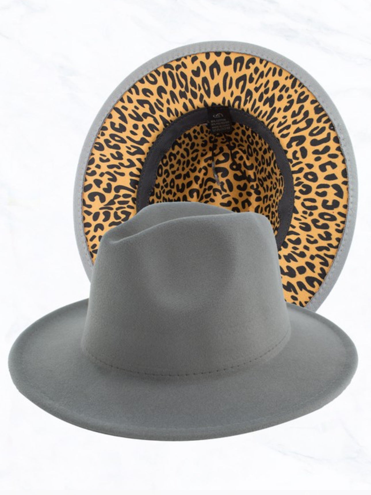 Add a stylish twist to a classic look with this grey fedora, featuring a hidden leopard print under the brim for a touch of personality and flair. The soft grey exterior offers a versatile, neutral base, while the leopard lining adds an unexpected pop of boldness that elevates any outfit.