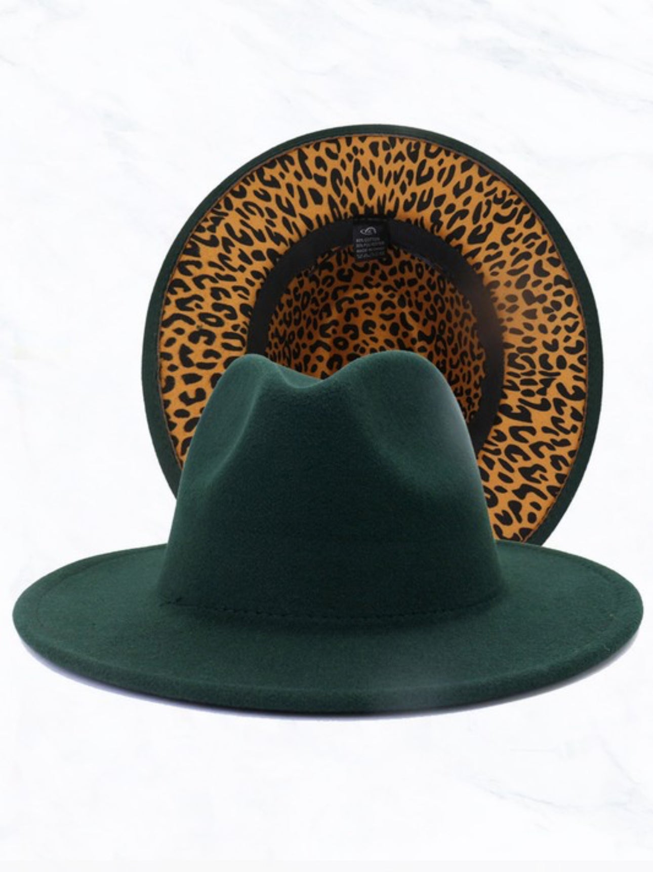 Make a stylish statement with this green fedora, featuring a bold leopard print under the brim for a playful and unexpected twist. The rich green exterior offers a versatile, sophisticated look, while the hidden leopard lining adds a touch of personality and flair.