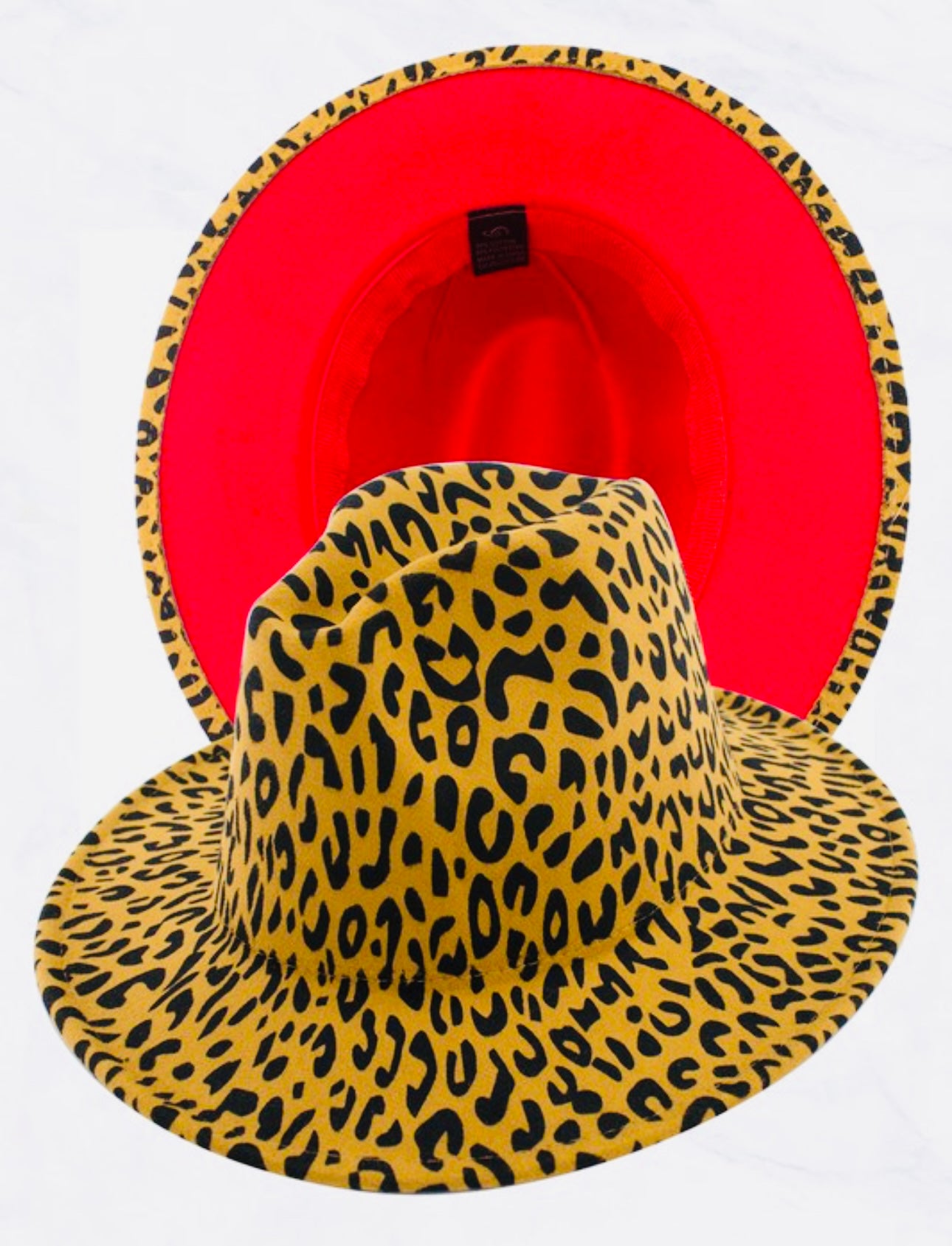 This is a stylish wide-brim fedora hat with a bold leopard print design. The hat’s exterior features a golden-yellow background covered in irregular black leopard spots. The underside of the brim and the inner lining are a vibrant red, adding a striking contrast to the animal print. The combination of the warm golden tones, black spots, and red interior gives the hat a fashionable, statement-making appearance.