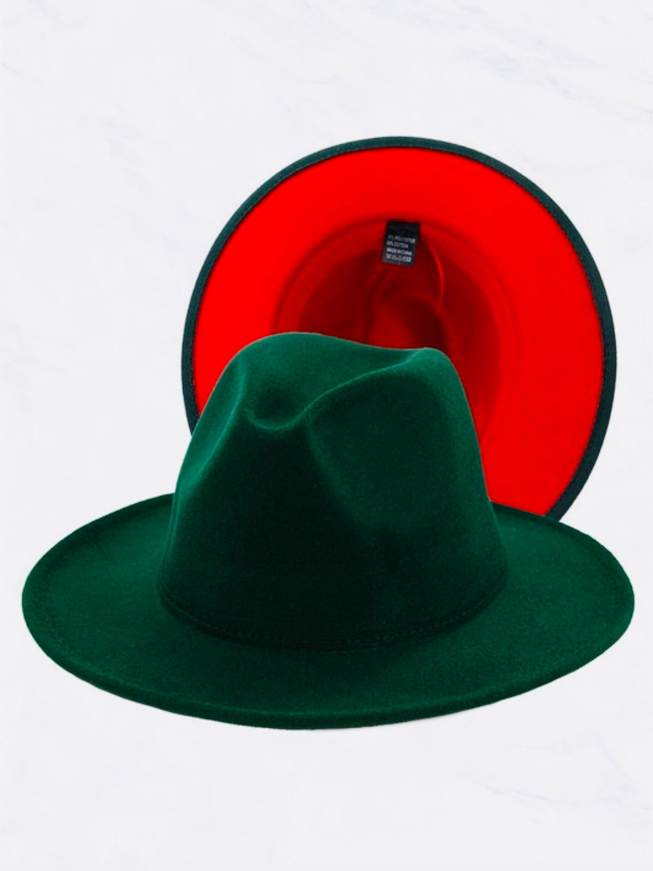 Add a playful twist to a classic accessory with this green fedora, featuring a bold pop of red under the brim. The rich green exterior exudes sophistication and versatility, while the hidden red lining adds a vibrant, unexpected accent that makes the hat stand out.